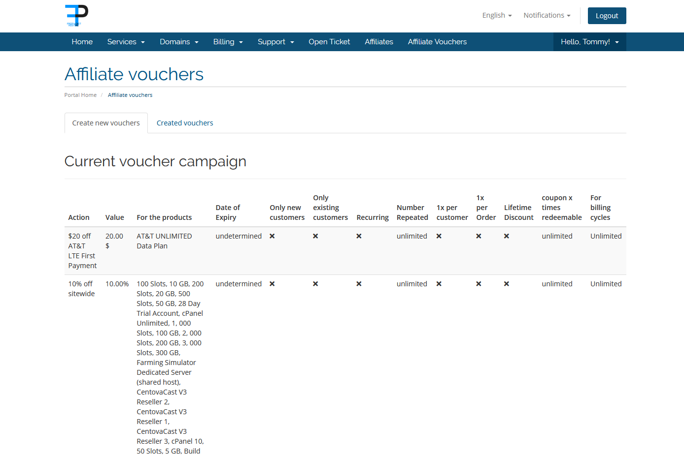 Click the Affiliate Vouchers button to view currently available vouchers and to create your own promo code.The page will look like this